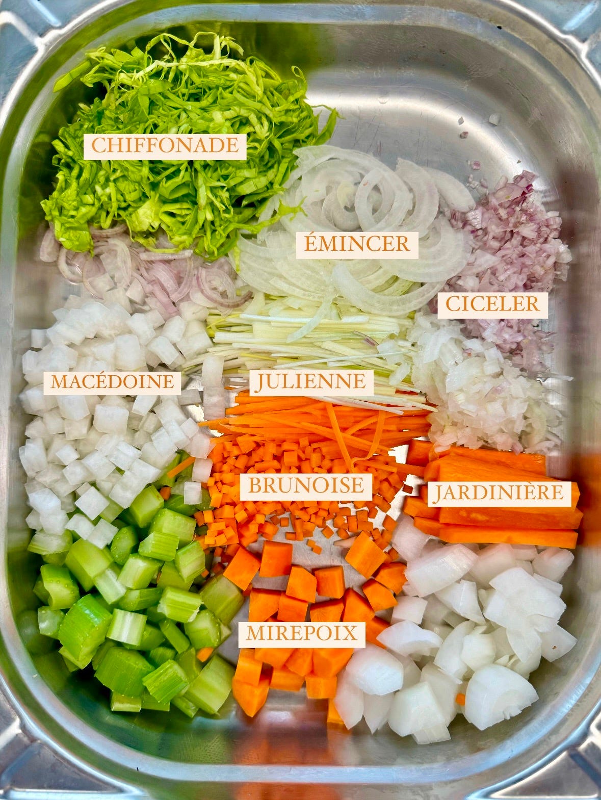 Here is a basic breakdown of each, in case any of you are interested in practicing your knife skills back at home: